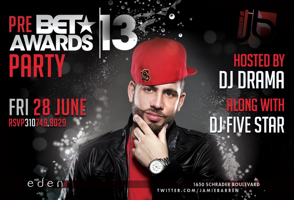 Friday, June 28th 2013 – Bet Awards 2013 Pre-Party hosted by Dj Drama along w/ Dj Five Star. Bottles Poppin’ & Celebrities Galore! Checkout Fridays at Eden online http://youtu.be/9PX-1N75lrM