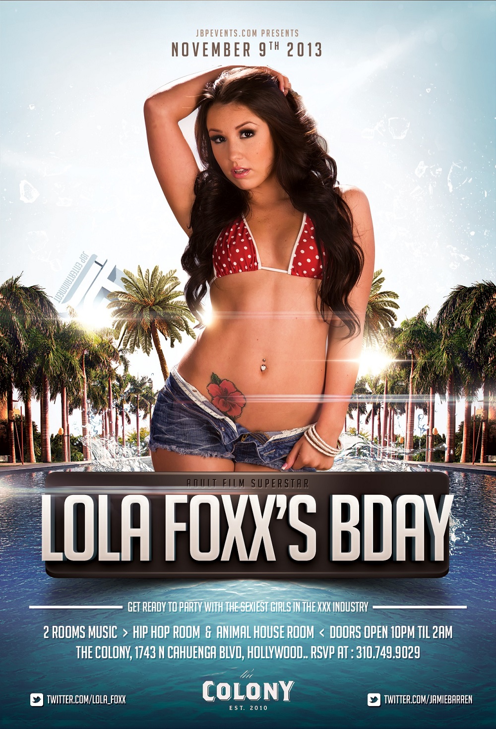 Colony Hollywood Saturday, November 9, 2013 – Jamie Barren presents ATMLA adult film superstar, Lola Foxx, birthday celebration from 10pm to 2am at Colony Nightclub located at 1743 North Cahuenga Blvd. in Hollywood. Make sure to arrive early, dress to impress and be 21/over with ID. To RSVP for the event, contact (310) 749-9029.