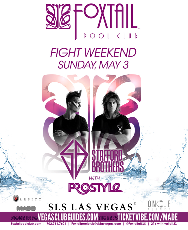 Fight Weekend 2015 Sunday Pool Party with Stafford Brothers along with DJ Prostyle performing (Sunday) May 3rd 2015 at Foxtail Pool Club, SLS Las Vegas Hotel and Casino, 2535 S Las Vegas Blvd, Las Vegas, NV 89109 – at 11:00 AM to 7:00 PM PST. Contact VIP host, Jamie Barren, for more information and table reservations (310-749-9029), or visit online at Vegasclubguides.com